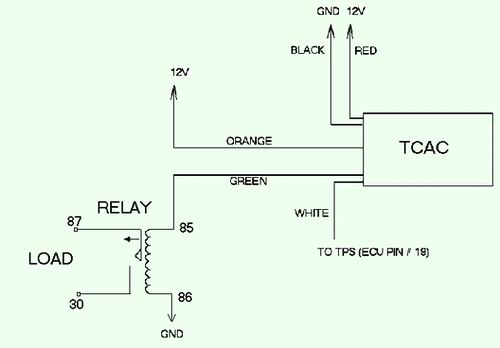 If you want to install TCAC in a different car or for a different application, other than control of the AC compressor follow this schematic: To trigger any other device than AC conditioner you must use a relay. The TCAC can supply as much as 500mA constant current to trigger the relay's coil. Connect the TCAC ORANGE wire to +12V source and the GREEN TCAC wire to the relay's coil (Pin #85). Ground the other side of the coil (Pin #86) to complete the circuit. Pins numbers 30 and 87 will be used to break or activate the desired circuit. The relay will "click" every time the throttle position reaches 60%. Remember there is a 6 second delay. If your application requires different delay time or throttle position cutoff, we need to customize TCAC circuitry. Contact us for details. |