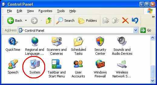 Determining your COM port: 1. First locate the "System" icon in the Windows Control Panel and double click it.