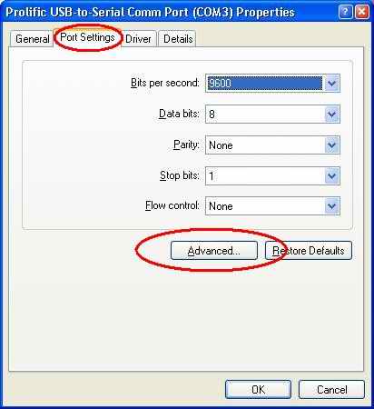 4. Select the "USB-to-Serial Comm Port" and right click on it or use the "File" --> "Properties" Menu item. In the window that appears select the "Port Settings" tab and then click on the "Advanced..." button.