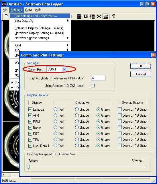 6. For the final step run the software. Choose the menu item "Settings"-->"Plot Settings and Comm Port...". In the dialog box change the "Comm Port" value match the one being used by your Serial-to-USB connector. If you are only using a serial connection try using the com ports listed from the device manager, usually COM1 and COM2. Press OK in this dialog and then the "Enter Key" to begin logging.